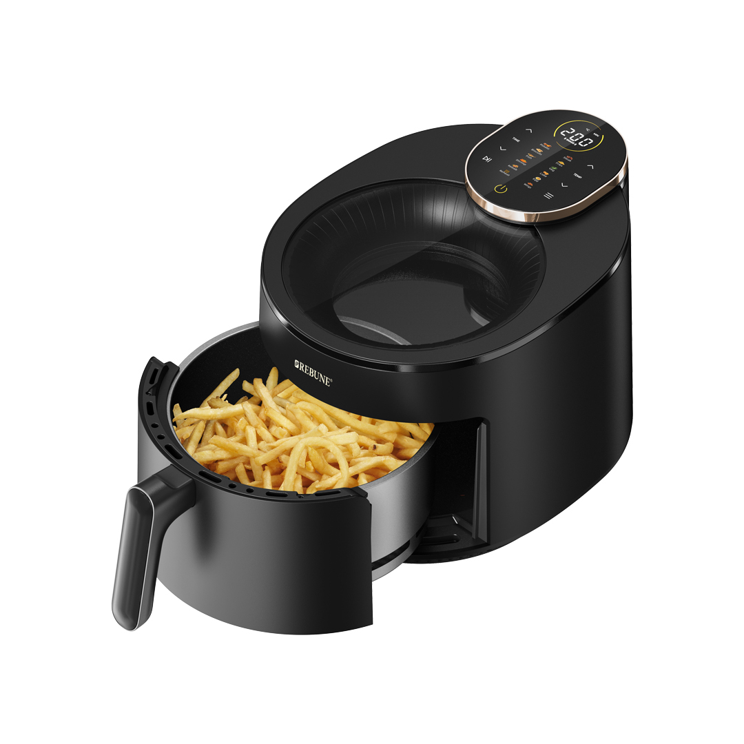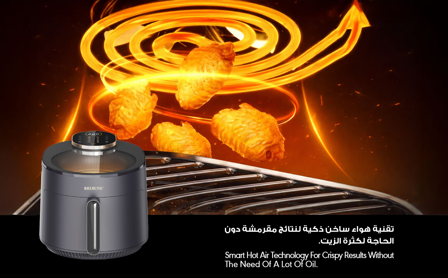 تأتي القلاية بنافذة علوية شفافة تمكنك من متابعة عملية الطهي دون الحاجة إلى فتح السلة، مما يحافظ على الحرارة داخل القلاية ويوفر لك تجربة طهي أكثر كفاءة. كما أن تقنية دوران الهواء الساخن تضمن طهي الطعام بشكل متساوٍ ليحصل على قوام مقرمش من الخارج وطري من الداخل.