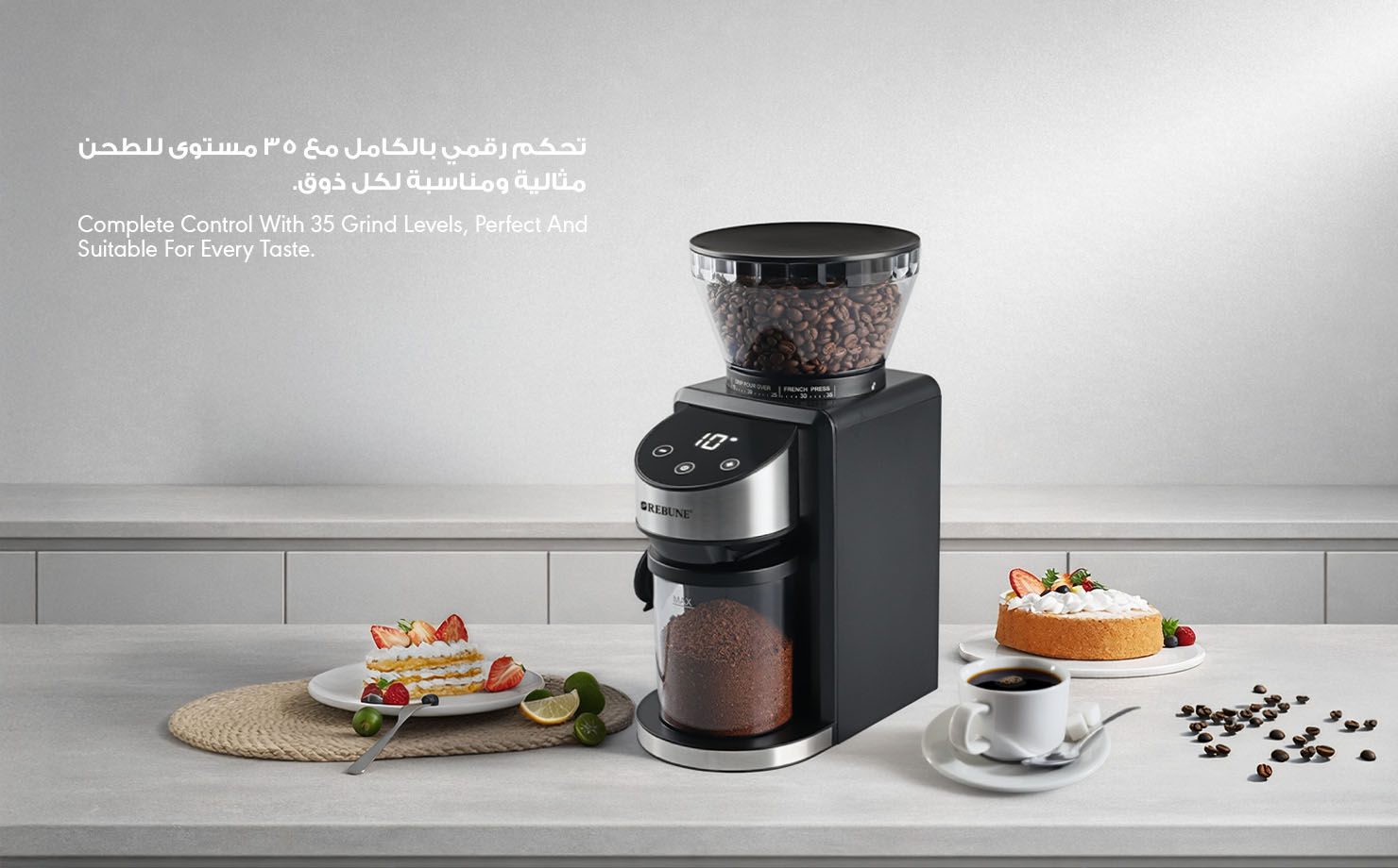 • تحكم بـ 35 مستوى طحن لتناسب جميع أنواع القهوة وذوقك الخاص