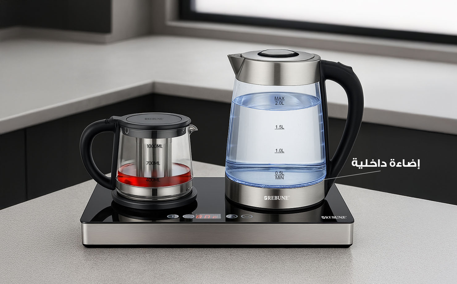 يأتي هذا الطقم مع قاعدة تحكم حرارية ذكية ويعتبر إضافة أنيقة لأي مطبخ، يجمع بين التصميم العصري وجودة التصنيع العالية من ريبون. بفضل الزجاج السميك الشفاف والإضاءة الداخلية الراقية، يمنحك تجربة غلي وتحضير شاي فاخرة بكل تفاصيلها. يجمع الطقم بين الأداء القوي وسهولة الاستخدام ليجعل لحظات الشاي أكثر راحة، جمالًا، ومتعة يومية.