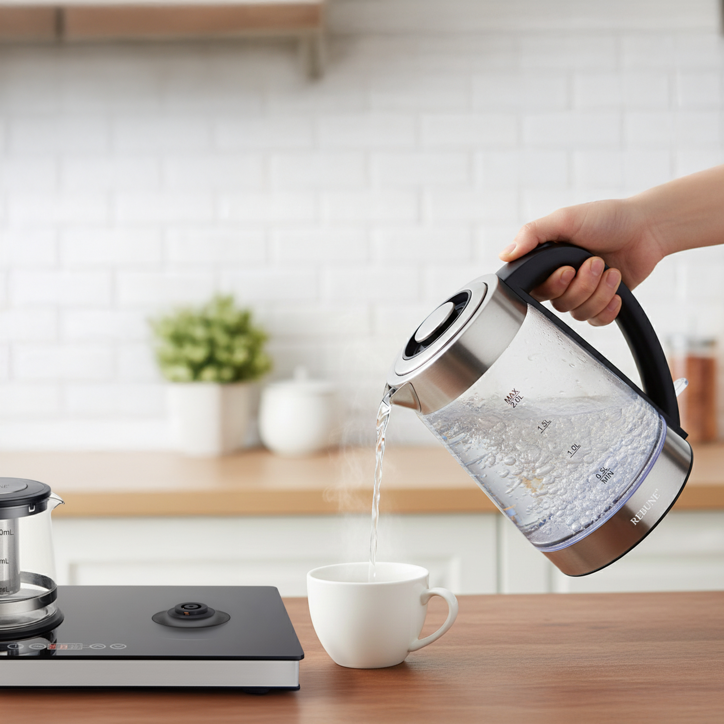 يأتي هذا الطقم مع قاعدة تحكم حرارية ذكية ويعتبر إضافة أنيقة لأي مطبخ، يجمع بين التصميم العصري وجودة التصنيع العالية من ريبون. بفضل الزجاج السميك الشفاف والإضاءة الداخلية الراقية، يمنحك تجربة غلي وتحضير شاي فاخرة بكل تفاصيلها. يجمع الطقم بين الأداء القوي وسهولة الاستخدام ليجعل لحظات الشاي أكثر راحة، جمالًا، ومتعة يومية.