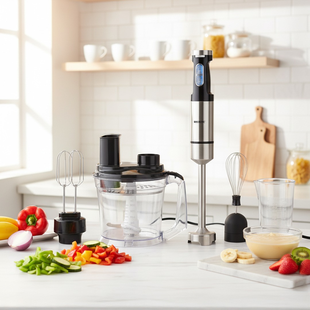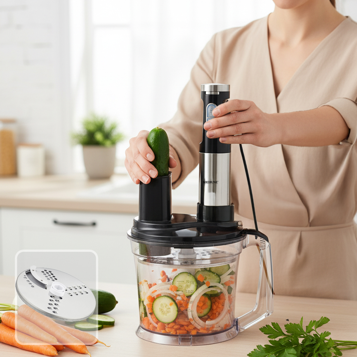 - وظائف متعددة: يفرم، يقطع، يبشر، يخفق البيض، ويخلط السوائل