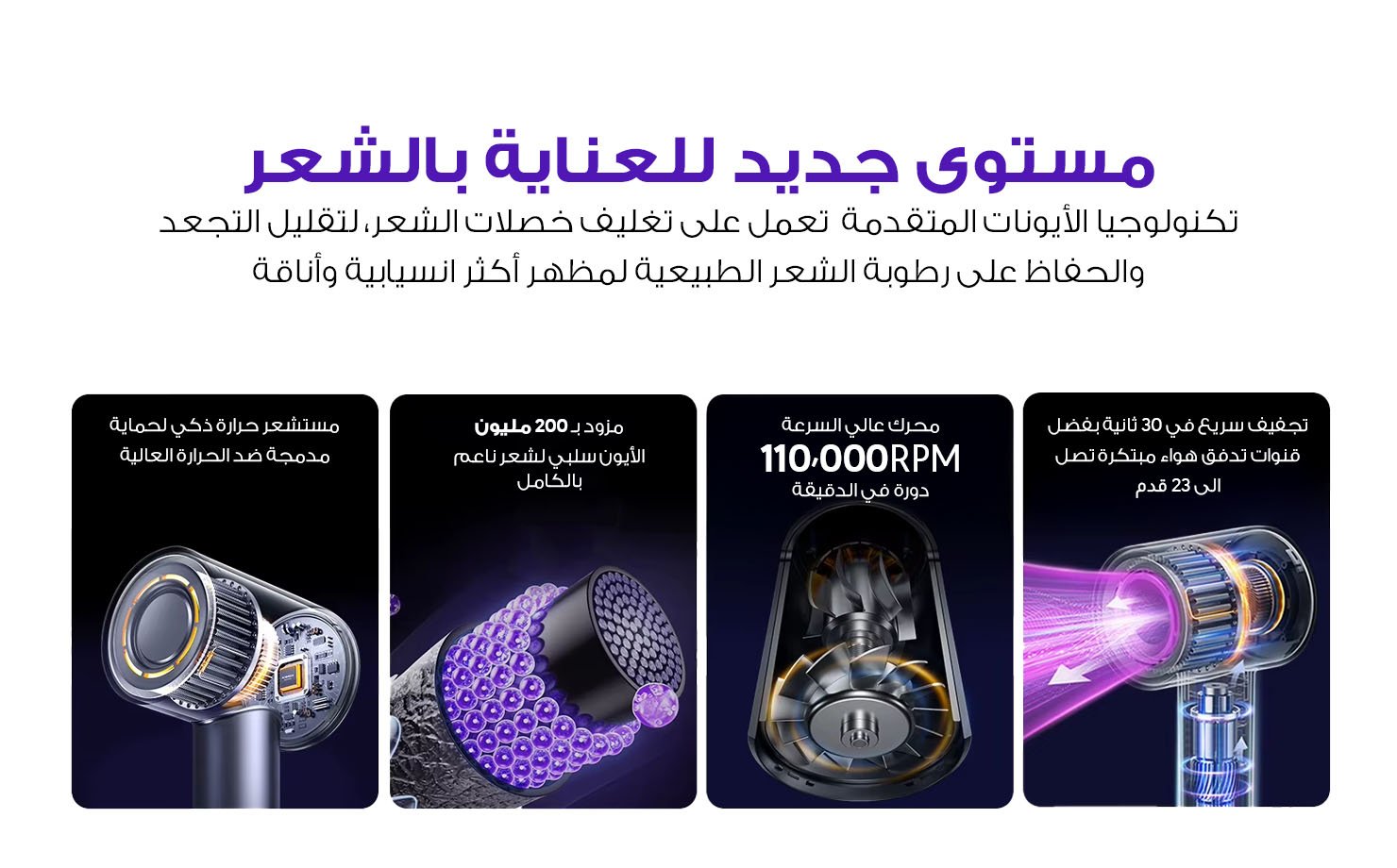 اكتشفي تجربة تصفيف استثنائية مع مجفف الشعر الأيوني عالي السرعة، المزود بمحرك BLDC المتطور وأحدث التقنيات. بفضل مستشعر الحرارة الذكي و200 مليون أيون سالب، الذي يحمي شعرك من التلف ويمنحه لمعاناً صحياً. استمتعي بقوة أداء مذهلة مع محرك يدور بسرعة 110,000 دورة في الدقيقة , مع قرص عطري يضفي على شعرك لمسة فريدة من العطر أثناء التجفيف .