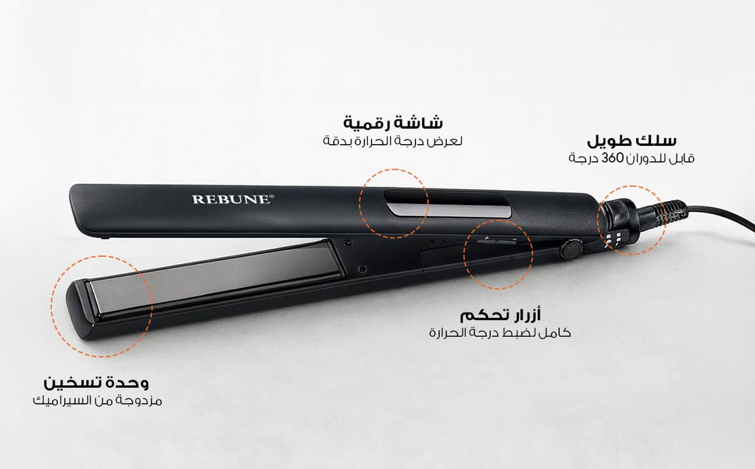 مزود بشاشة رقمية لعرض درجة الحرارة ووضع التشغيل بوضوح، إلى جانب سلك دوّار 360° يمنحك حرية حركة كاملة أثناء التصفيف. تصميمه المدمج والخفيف يجعل التصفيف أسرع، أسهل، وأكثر راحة، حتى في الأوقات المزدحمة.