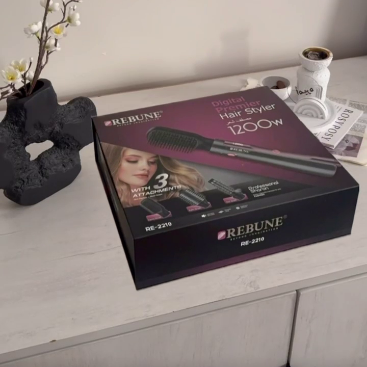 احصلي على شعر مذهل في دقائق مع ريبون استشوار شعر هوائي 3 في 1! الذي يجمع بين التجفيف والتنعيم والتصفيف. يتميز مصفف شعر ريبون بمحرك قوي، تقنية الأيونات، بفضل مع محرك بقوة 1200 واط، يعمل استشوار ريبون بكفاءة على تجفيف الشعر بسرعة .ورؤوس قابلة للتبديل لتناسب جميع .احتياجاتك في المنزل أو أثناء السفر