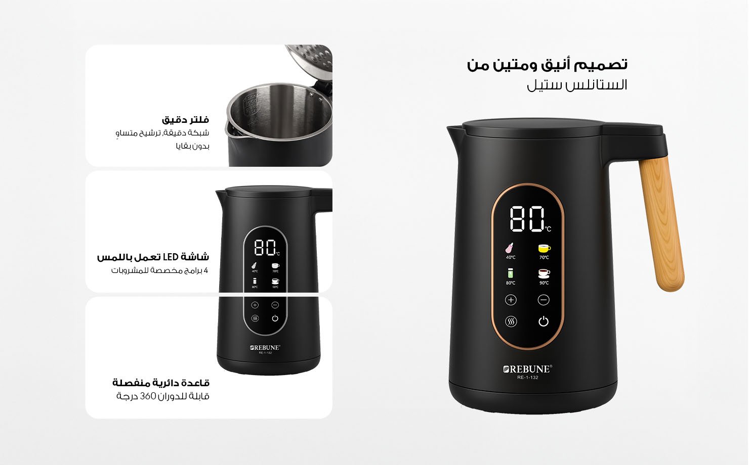تمنحك غلاية ريبون الكهربائية 1.7 لتر تجربة غليان متكاملة، بفضل شاشة LED تعمل باللمس وتحكم دقيق بدرجة الحرارة. مصنوعة من الستانليس ستيل المقاوم للصدأ مع تصميم عصري باللون الأسود، لتكون قطعة أنيقة وعملية في مطبخك.