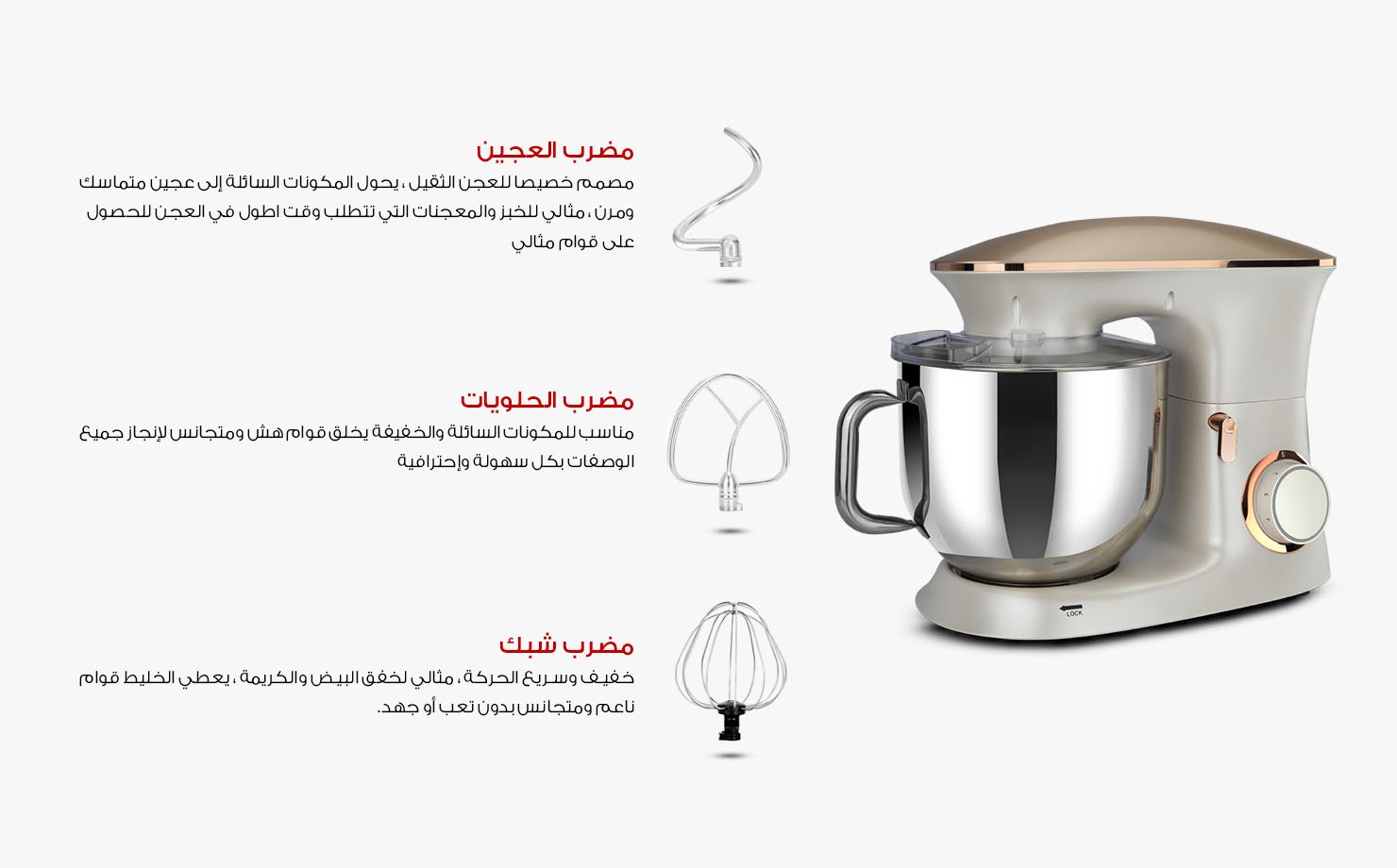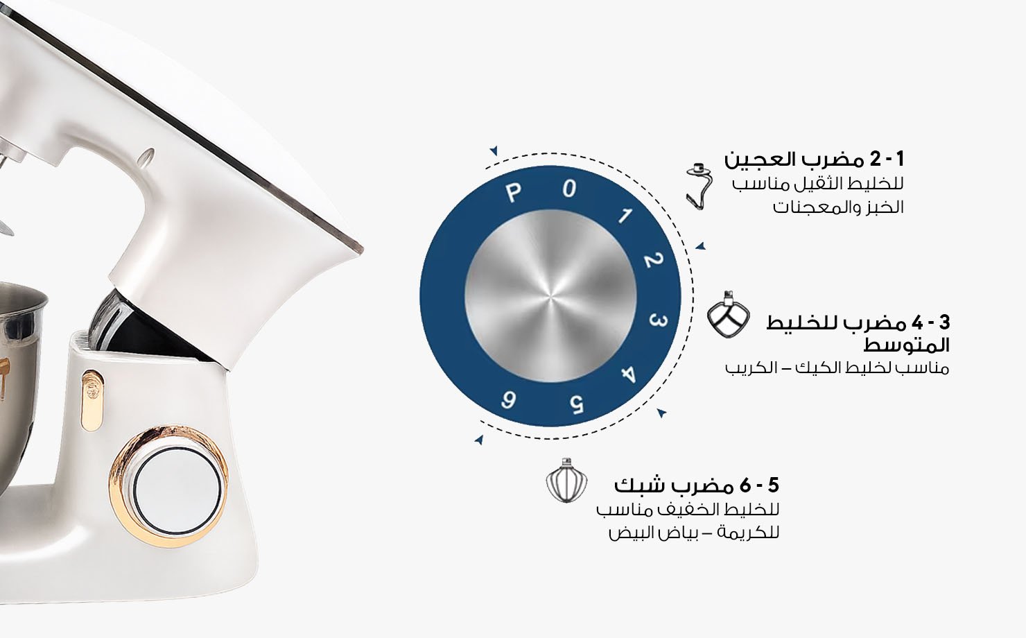 - عدة سرعات قابلة للتعديل لتناسب مختلف أنواع العجائن والخليط